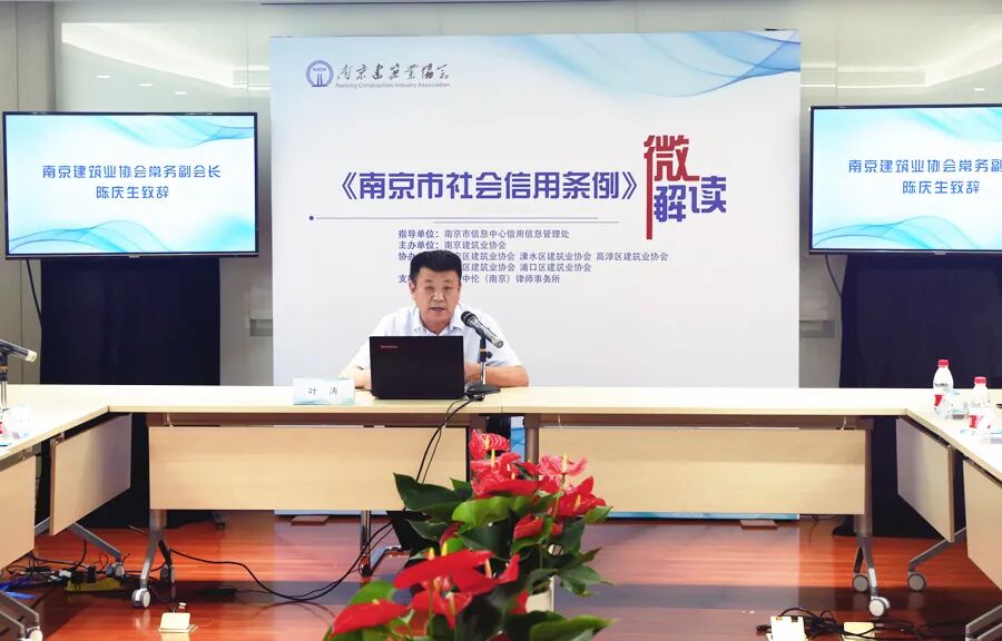 本次活动由南京建筑业协会发起主办,活动采用线上直播和线下研讨相结合的“1+N模式”,通过网络平台面向南京市广大建筑企业同步直播。活动由协会副会长兼秘书长叶涛主持,南京市信息中心信用信息管理处处长、南京市公共信用信息中心主任殷小军受邀出席活动并做政策解读,南京建筑业协会监事周立芹女士也一同出席了本次活动。